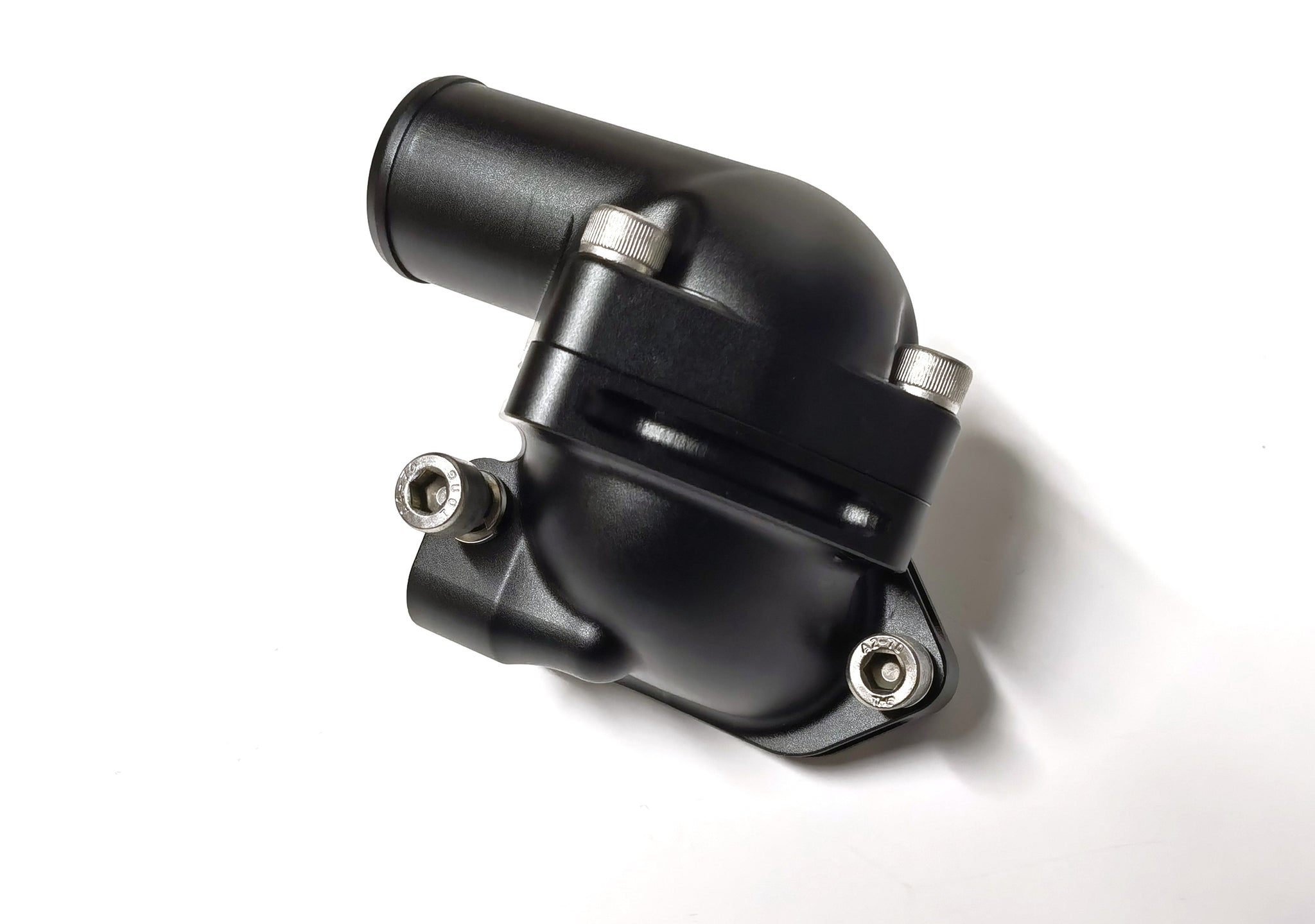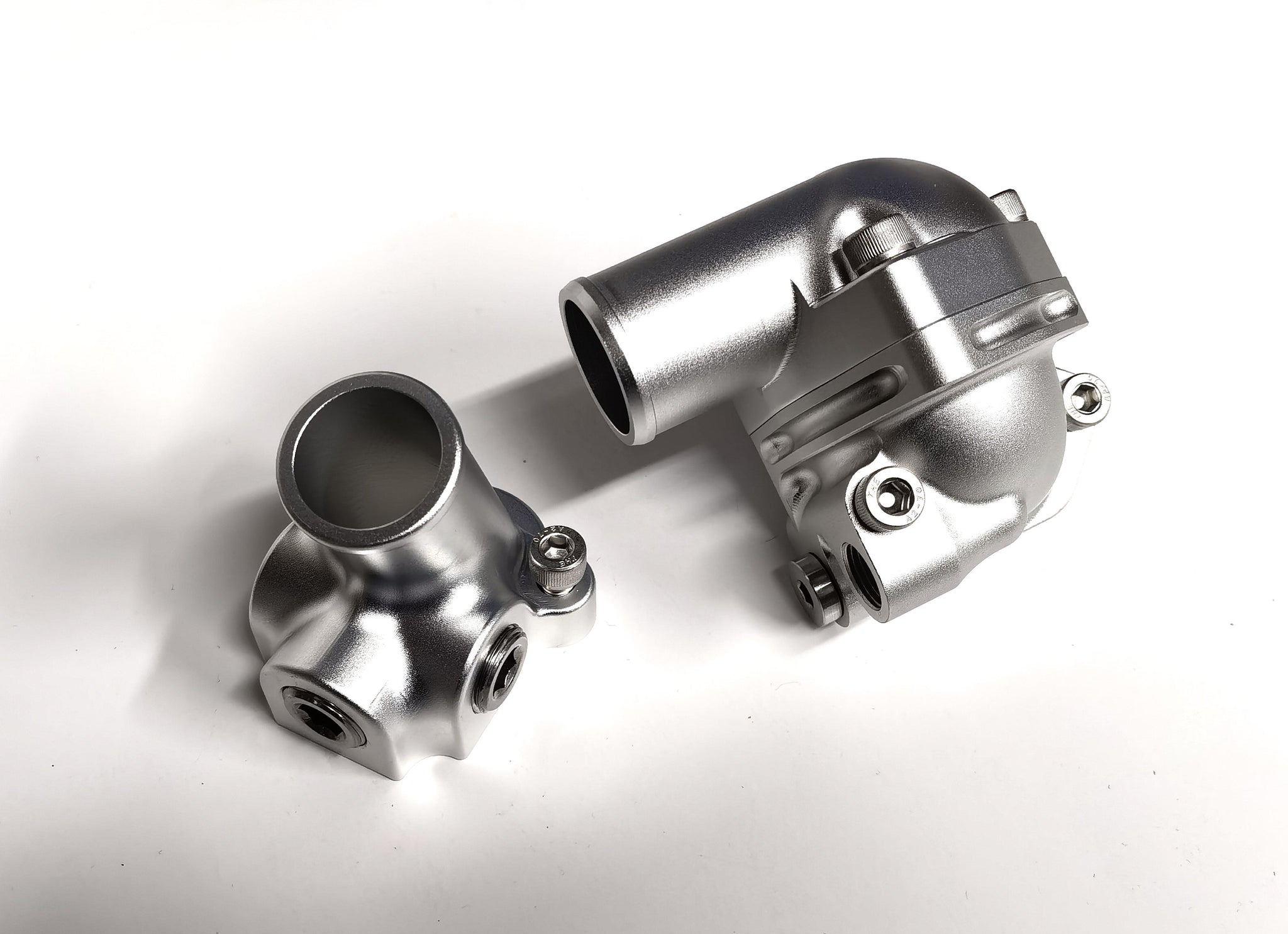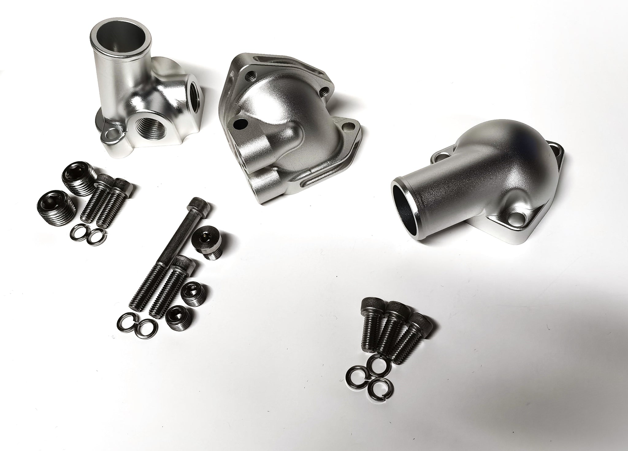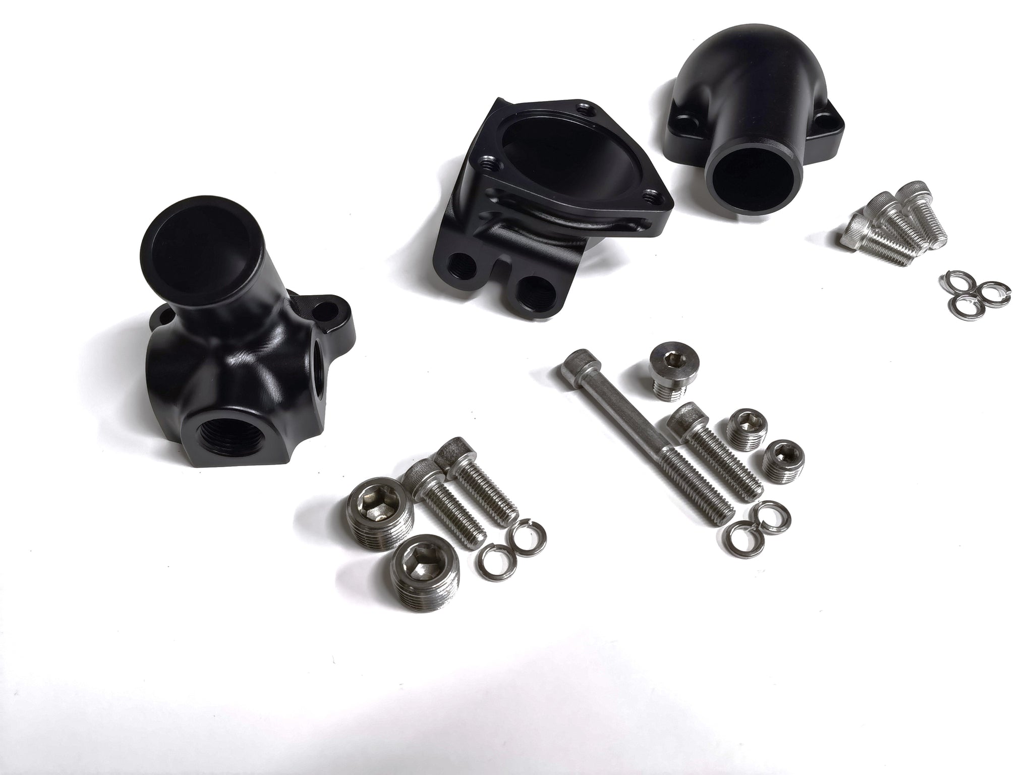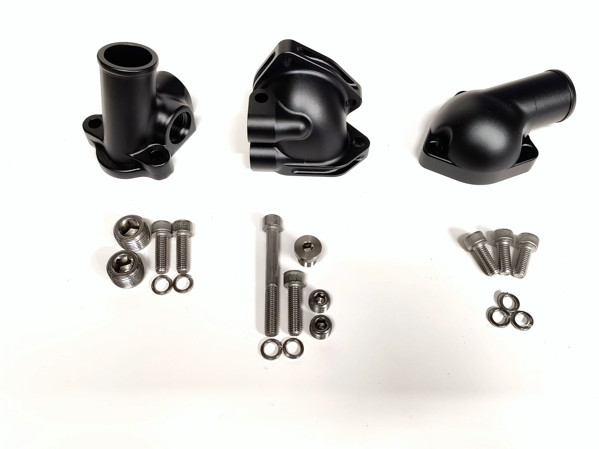 ProTunerz 3piece Thermostat Housing kit + Water Neck. CNC machined from 6061 Aluminum, bead blasted then Anodized in silver and black!